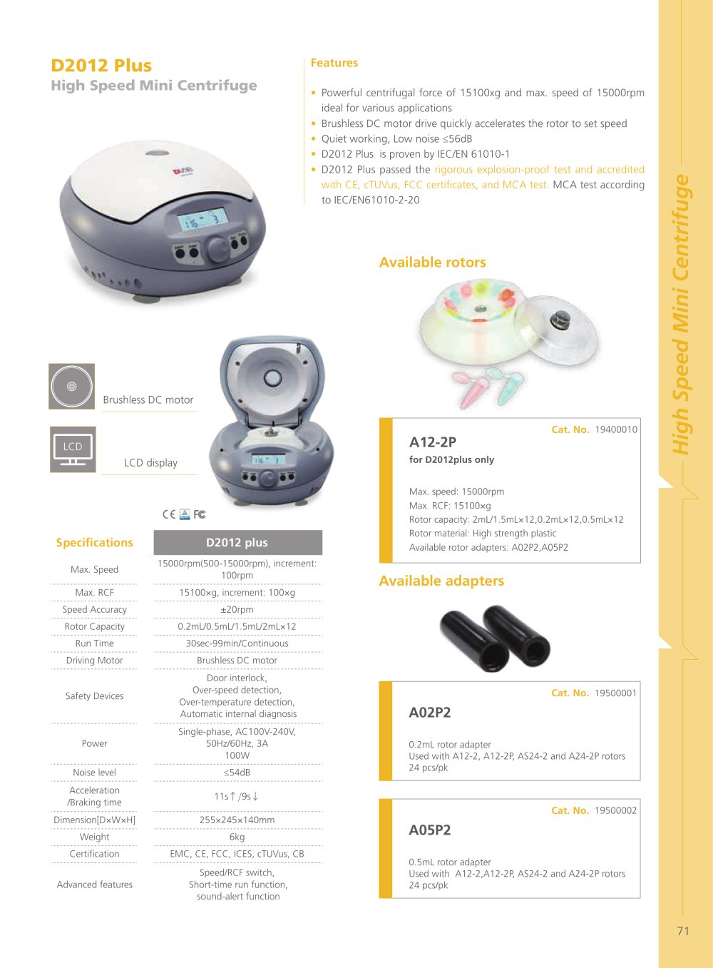 La microcentrífuga digital D2012 Plus combina potencia, seguridad y un diseño compacto, ideal para laboratorios con espacio reducido que requieren alto rendimiento. Equipada con un rotor para 12 tubos de 1.5/2 mL, alcanza velocidades de hasta 15,000 rpm (15,100×g) con funcionamiento silencioso y confiable.