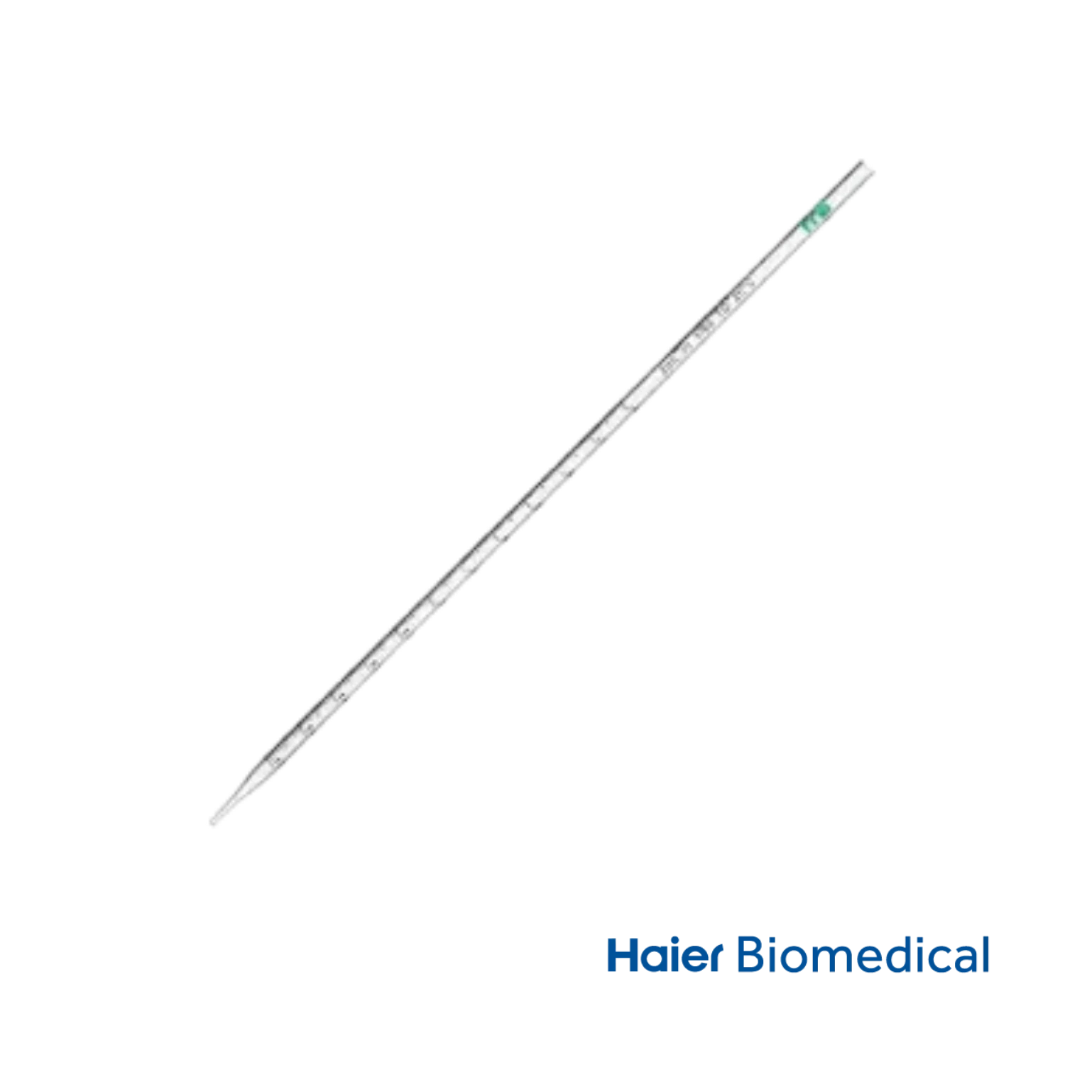 Pipeta serológica 2 mL verde, estéril, marca Haier, diseñada para mediciones y transferencias de líquidos precisas en aplicaciones de cultivo celular, serología y otros ensayos de laboratorio rutinarios y de investigación. Fabricada en poliestireno de alta transparencia, ofrece lectura clara de la escala, excelente control del volumen y compatibilidad con medios de cultivo y soluciones acuosas habituales en laboratorio.