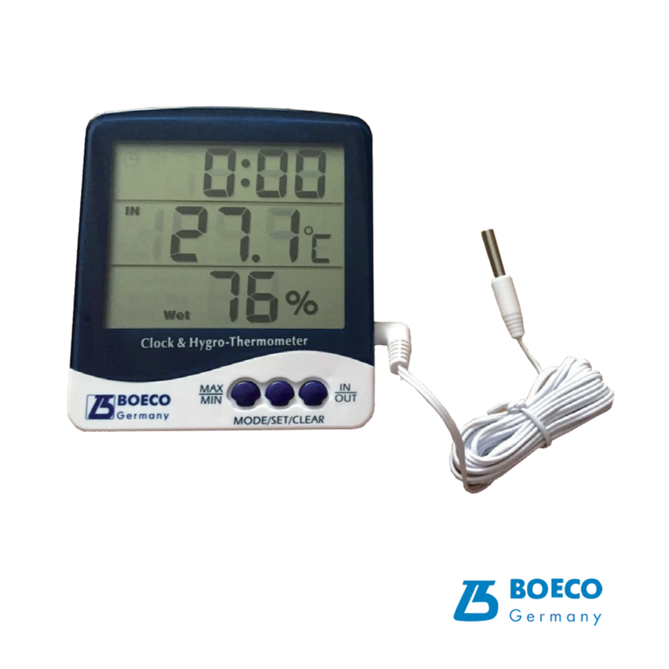 Mide temperatura y humedad con precisión. El termohigrómetro Boeco BOE 327 incluye reloj digital, sonda externa y registro máx./mín